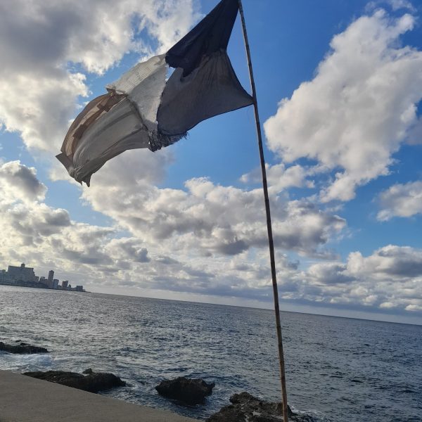 Los quimbos se marcan con trapos atados: señales vitales que declaran «aquí hay alguien» frente al olvido y la maquinaria. Guajiros traslada ese acto privado al Malecón: planta la bandera en hormigón salado, frente al mar…