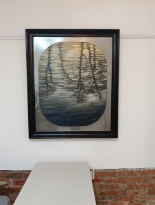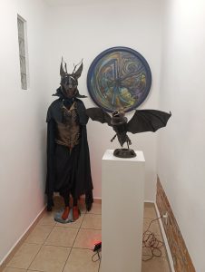 Sal Moreno: Muchas gracias a Artcrónica por la visita a esta exposición “Serenata penumbra” … Pues el criterio de selección fue de conjunto con el director de la galería Manuel Díaz Martínez. Yo propuse un número de piezas y finalmente ellos optaron por fusionar arte objeto con pintura, recuperando algunas obras que tienen ya muchos años, como este retrato que vemos acá y también colocamos piezas más recientes. La muestra es en realidad un poco retrospectiva. Hacemos énfasis en los trabajos que son más tenebristas, más al temple. Por otro lado, esta esa nueva tendencia que proviene en buena medida de lo que trabajamos en el seminario o tutorial técnico y curatorial con el maestro Arturo Montoto y contigo, lo cual tengo muy presente. Es mi intención darle continuidad a esa importante experiencia.