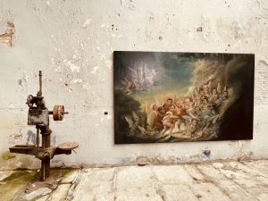 Gore se mueve con soltura entre el dibujo, el arte urbano, el arte corporal y la pintura, disciplina con la que ha generado fuertes controversias, especialmente a partir de sus críticas directas a figuras como Donald Trump. Resulta inolvidable la obra en la que lo retrata desnudo, desmontando el símbolo del poder desde la ironía al representar al mandatario con un diminuto pene, imagen que le ha valido a la artista censura y problemas legales. En Apocalipsis Now, el visitante se encuentra con pinturas de atmósfera angelical pobladas por querubines incómodos, irónicos y radicales, que tensan lo sagrado y lo político en un mismo plano.