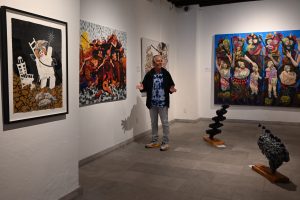 La exposición del maestro de la plástica panameña Rodney Zelenka, nos deja ver –a través de pintura, dibujo y escultura– una serie de obras que abordan la manera en que se establecen las relaciones de poder que gobiernan el mundo. Problemáticas sociales, el abuso de la autoridad y diversas realidades humanas, son retratadas en diferentes estampas sobre la vida cotidiana, las jerarquías y el autoritarismo de nuestra sociedad contemporánea, vistas como en radiografía por los ojos del artista.