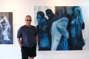 Mi pintura antes de esta etapa era muy colorista, de hecho, soy un colorista empedernido; pero llegaron los apagones, mi estudio es una nave de 17 metros de largo por 6 de ancho y 7 de alto, que tiene una sola puerta. Cuando el sol va pasando aparece la penumbra. Entonces tenía dos opciones: no pintar o comenzar a pintar con esta gama más monocromática. Así pinté toda esta serie que viene desde el 2024 que se llamó “Felicidad”, alegorizando el tema de alguna manera. Por contingencia emigré hacia esa paleta; pero después me gustó la solución.