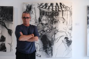 Adrián Socorro: Esta faceta de dibujante viene porque yo no creo en la Musa, ni en la inspiración. Yo me levanto a las 6 de la mañana, le preparo el desayuno a mi hija y a mi esposa, llevo a mi niña a la escuela, y a las 8 menos diez ya estoy en mi estudio comenzando la faena. Eso es de lunes a lunes, hasta las 7 de la noche, a veces voy un rato al gimnasio, ya a las 7 cierro, me tomo un traguito con algún amigo y me retiro a mi casa. Ese proceso, que yo catalogo “casi budista”, es lo que me lleva a mi a dibujar. Pero cuando me aburro un poco suelto la pintura y me voy a dibujar, y viceversa, cuando me aburro del dibujo me pongo a pintar. No soy un artista prejuicioso en ese tema de defender una sola temática, un solo modo de hacer. Me gusta la pintura, y la voy desarrollando en el cuadro hasta un límite en el que me sienta satisfecho formal y compositivamente.