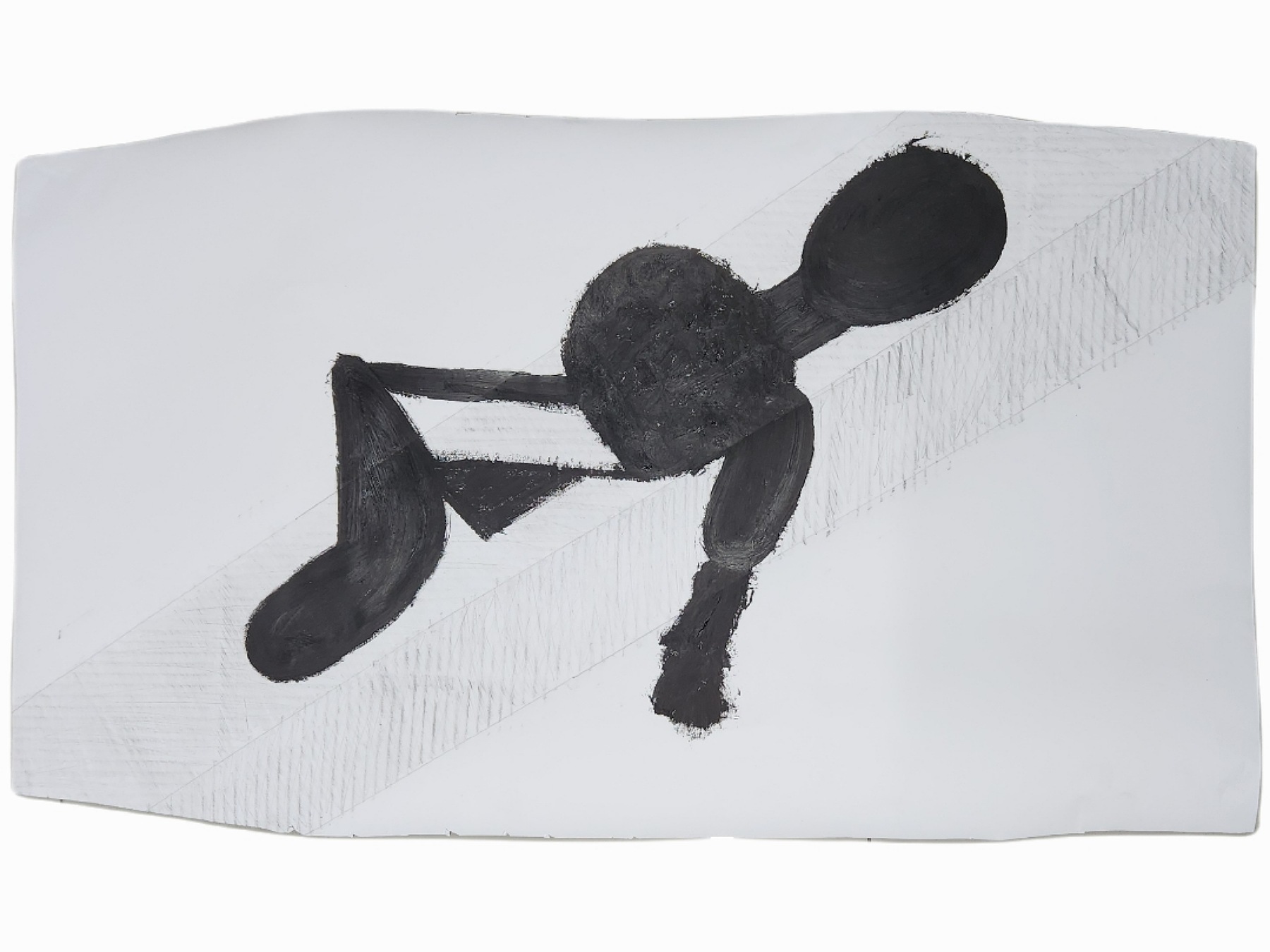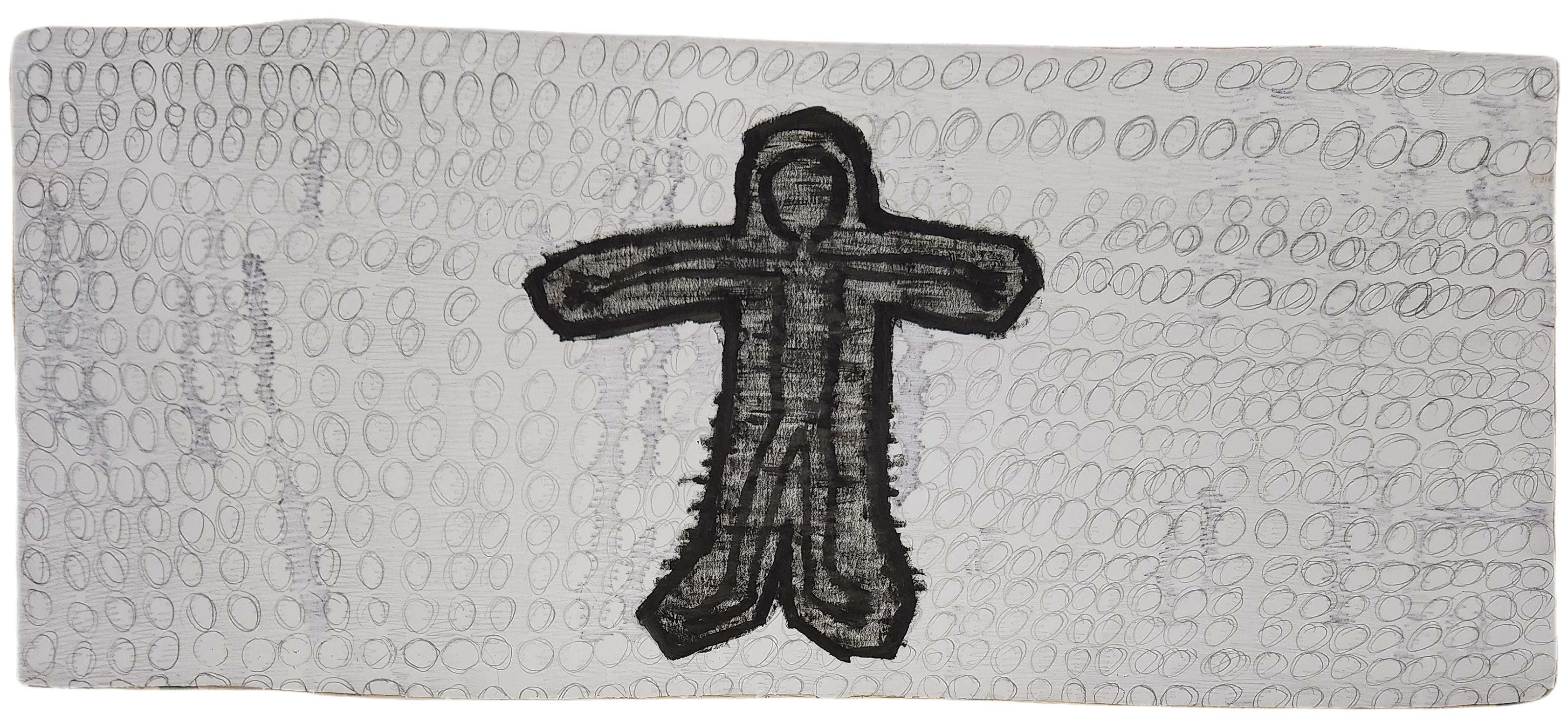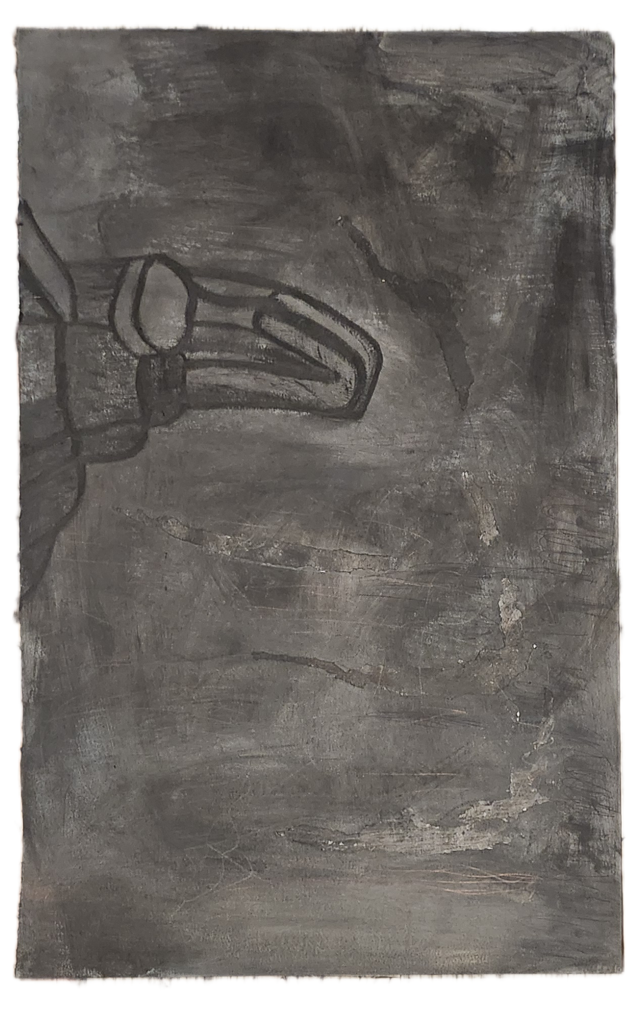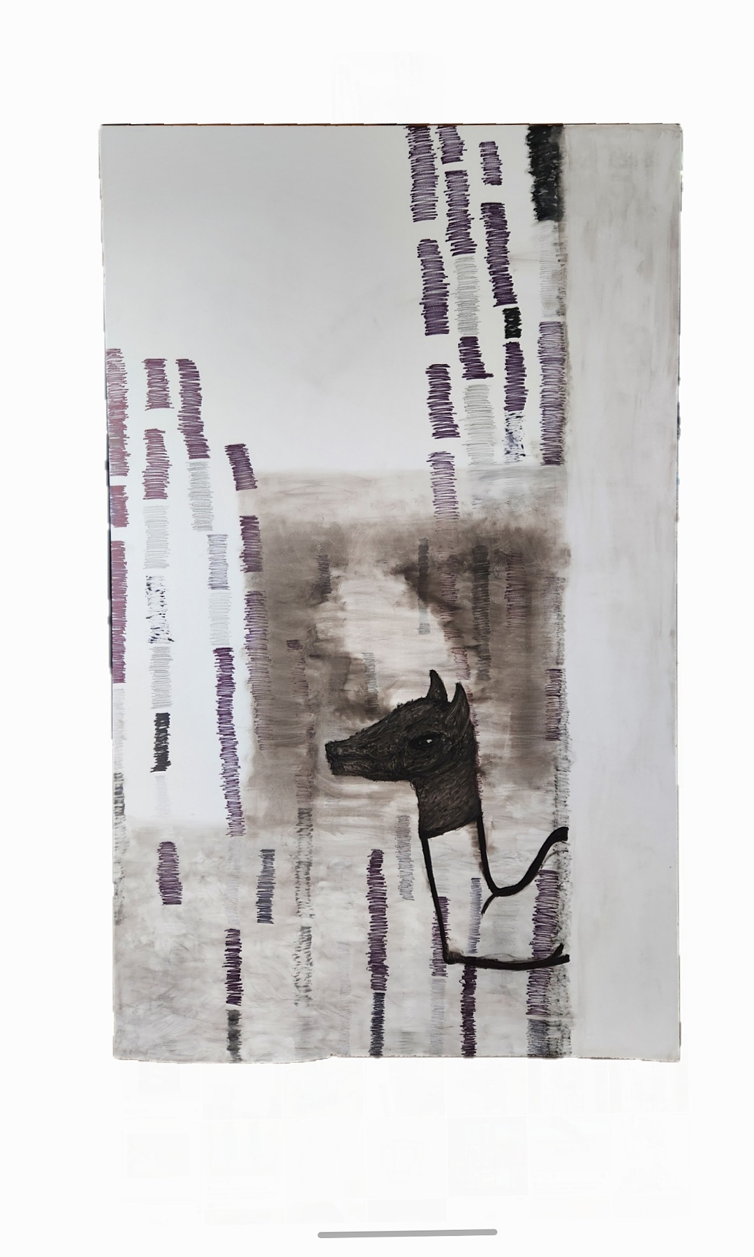 Sombra con mano. (El perro.) 06/2025. Lápiz, pluma, plumón, pincel recargable, tinta para sellos y óleo sobre melamina. 200 x 122 cm