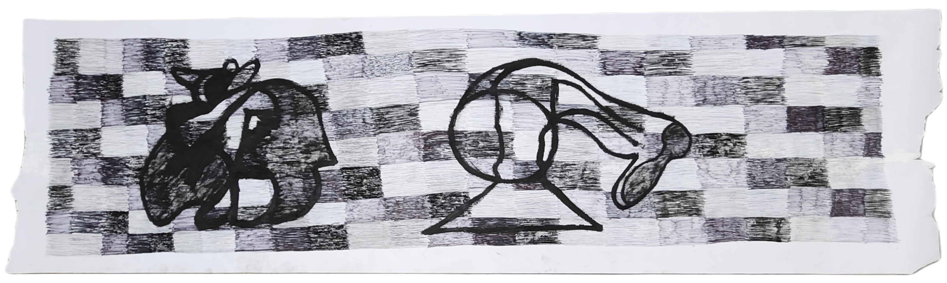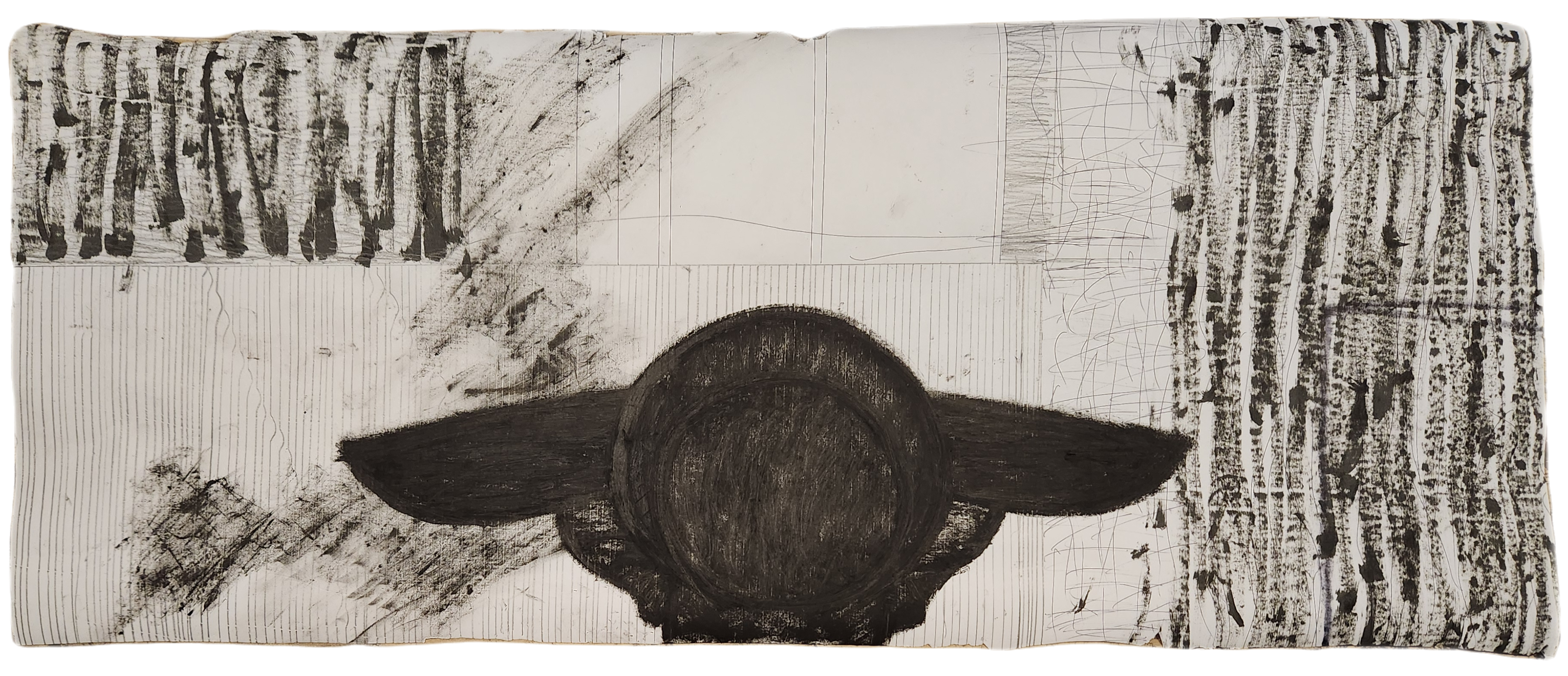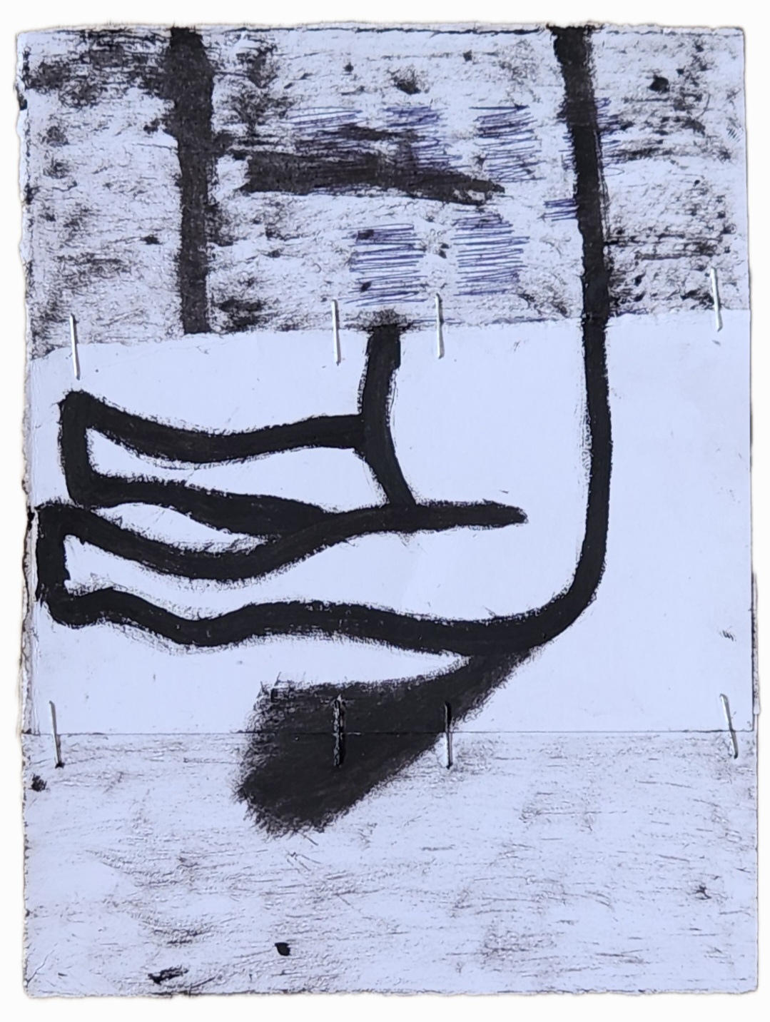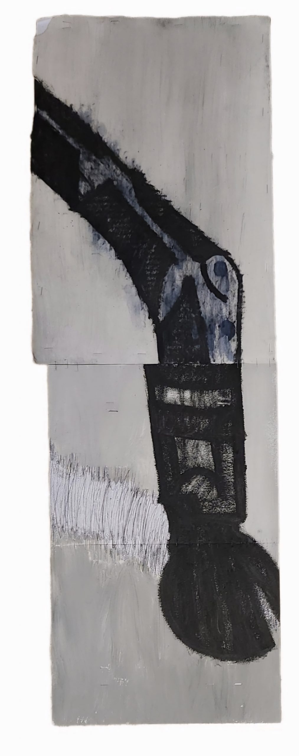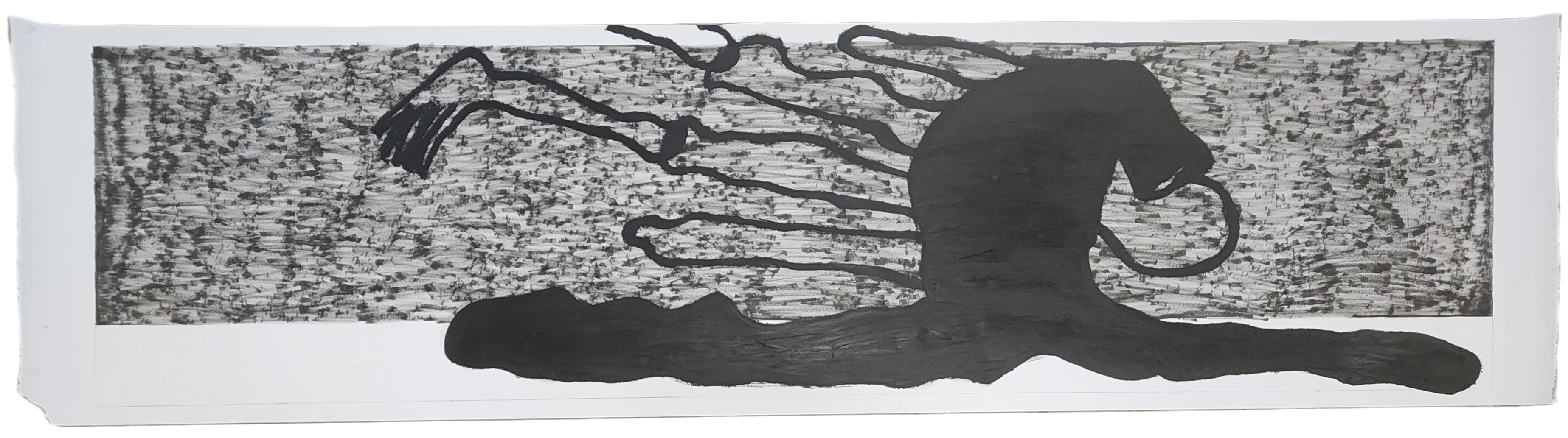 Sombra con mano. (El perro.) 06/2025. Lápiz, pluma, plumón, pincel recargable, tinta para sellos y óleo sobre melamina. 200 x 122 cm