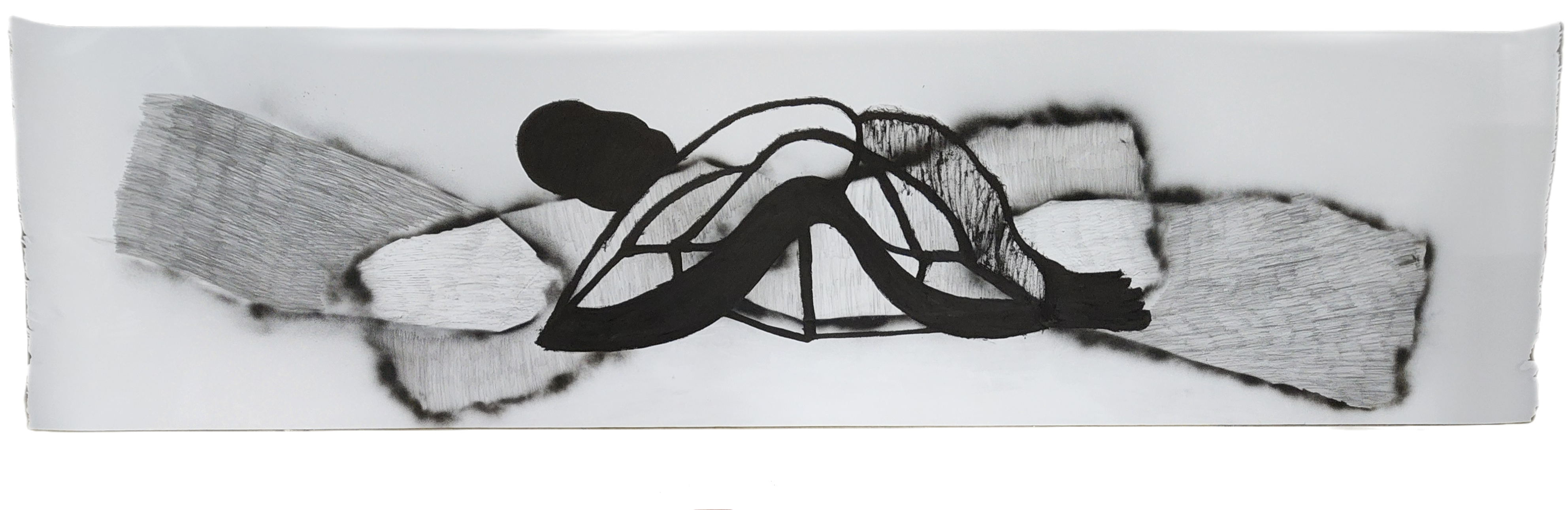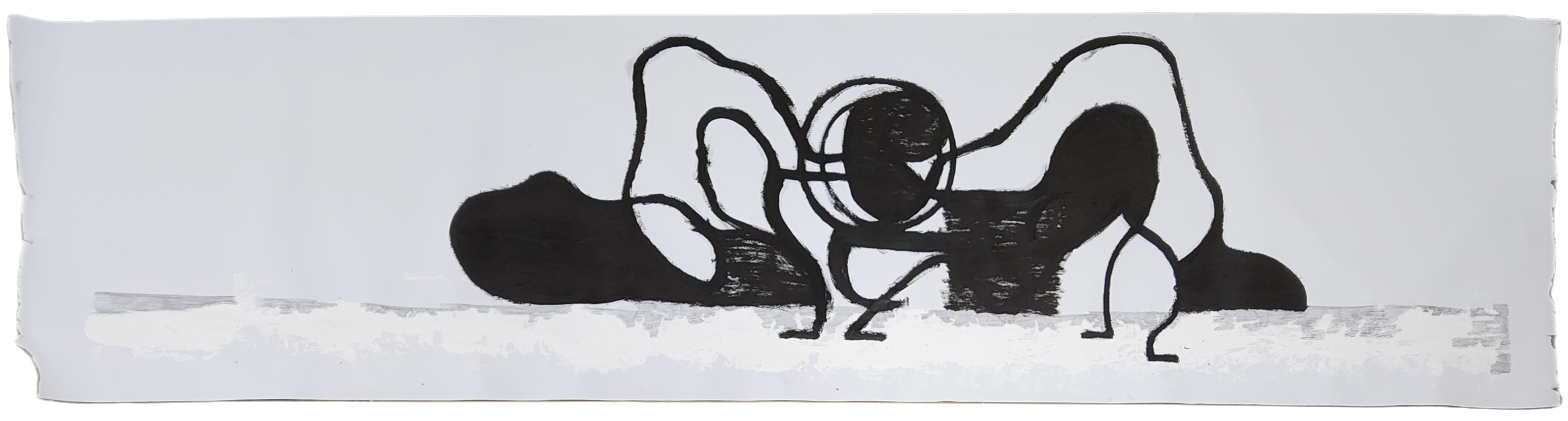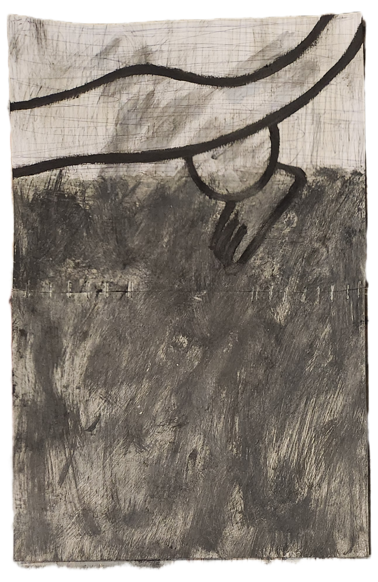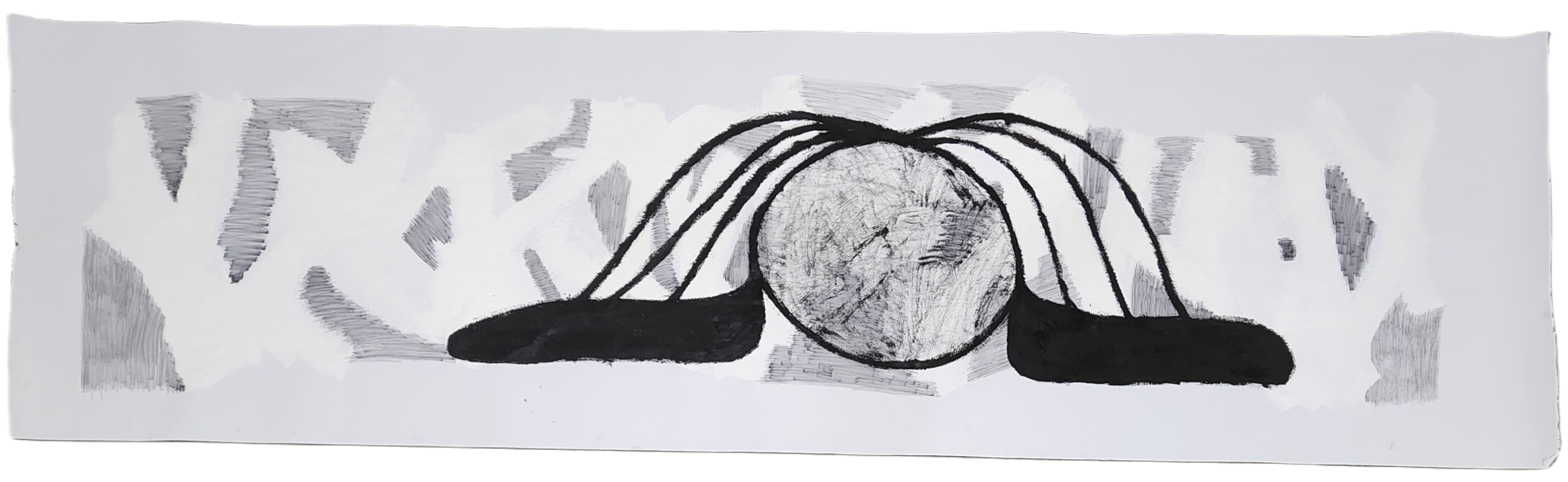 Sombra con mano. (El perro.) 06/2025. Lápiz, pluma, plumón, pincel recargable, tinta para sellos y óleo sobre melamina. 200 x 122 cm