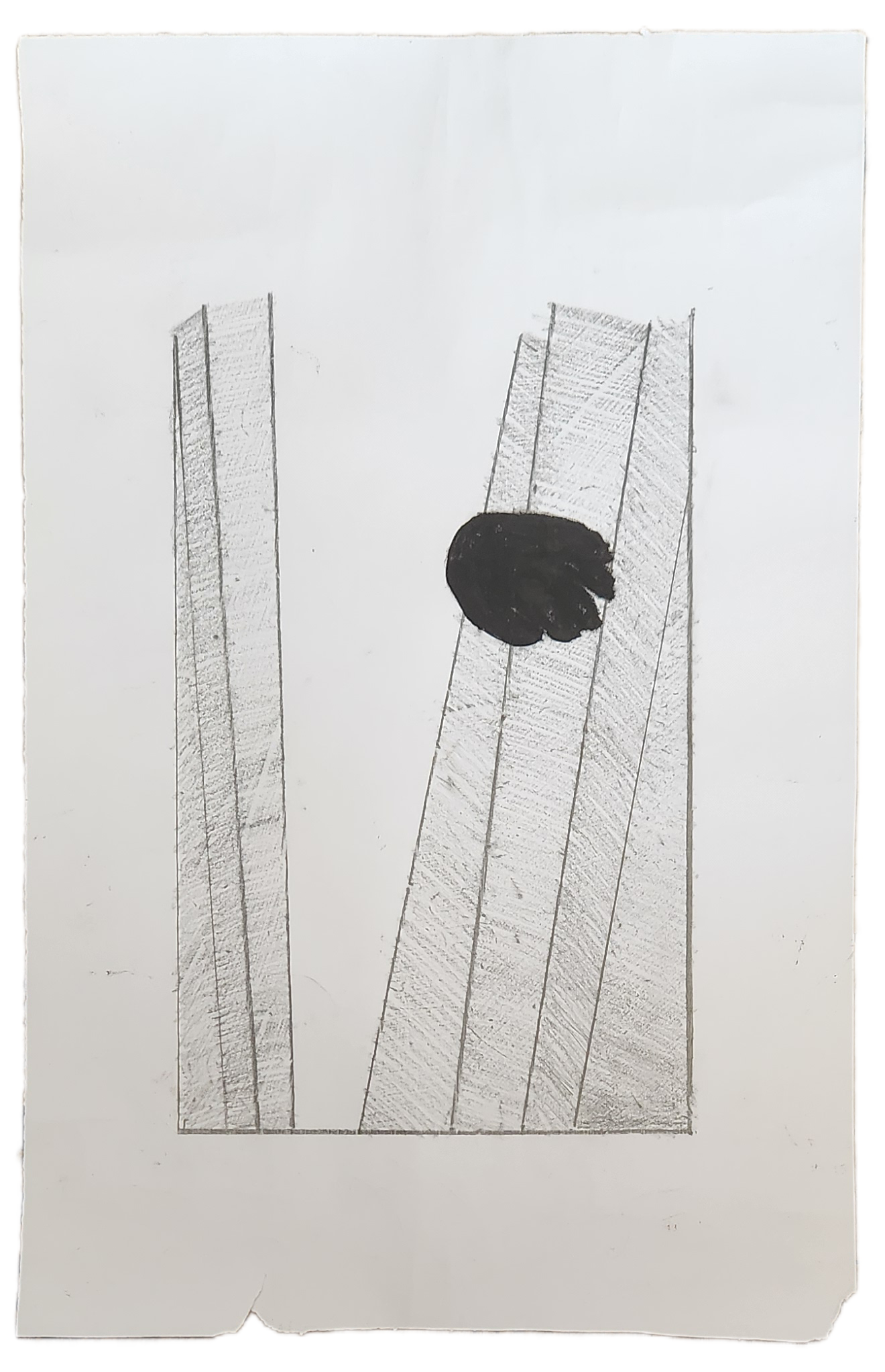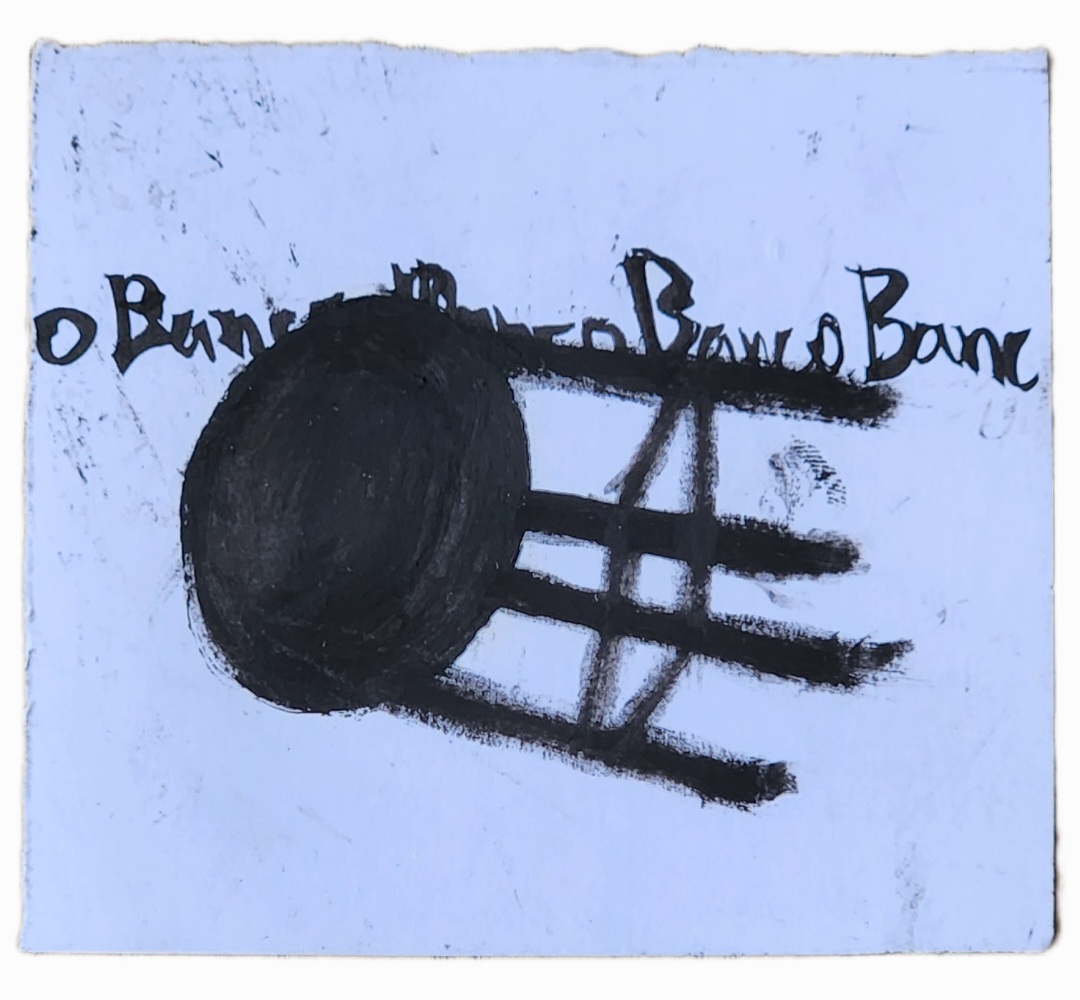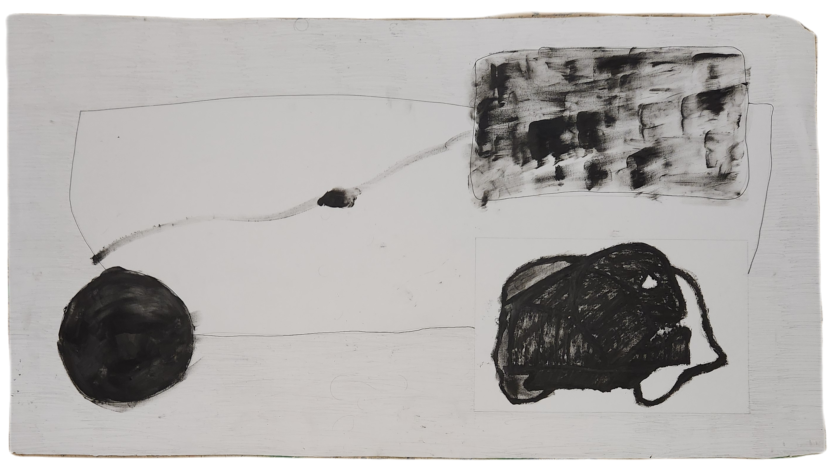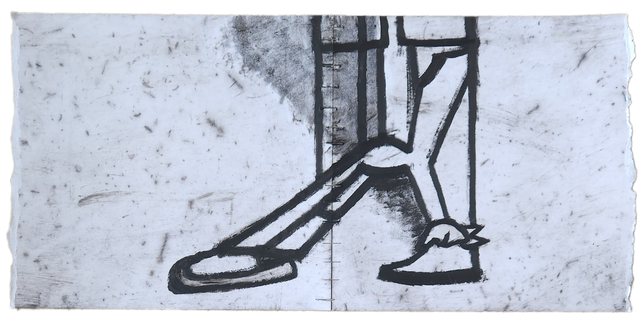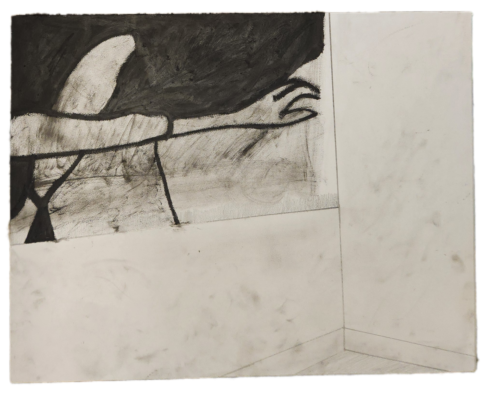 Sombra con mano. (El perro.) 06/2025. Lápiz, pluma, plumón, pincel recargable, tinta para sellos y óleo sobre melamina. 200 x 122 cm