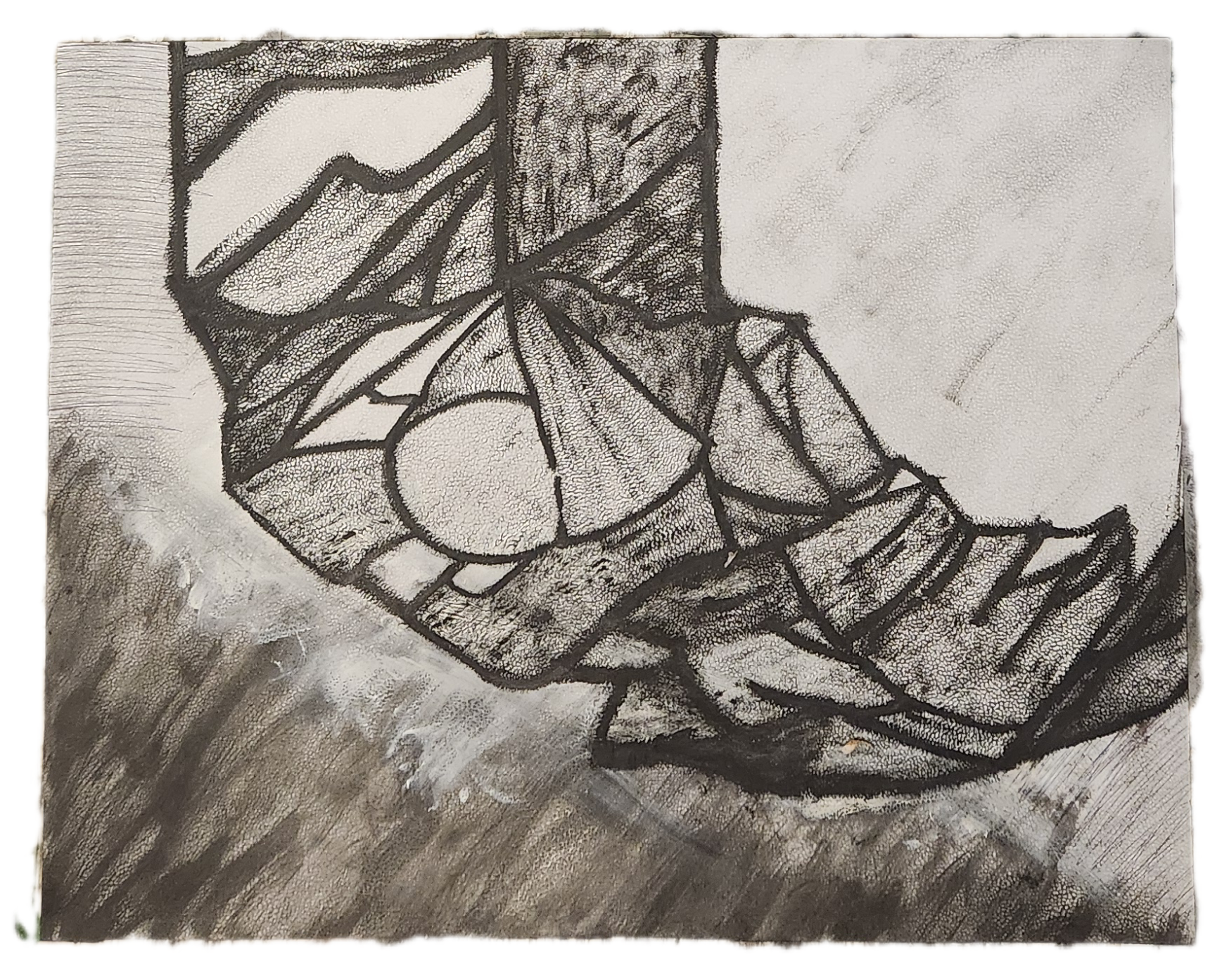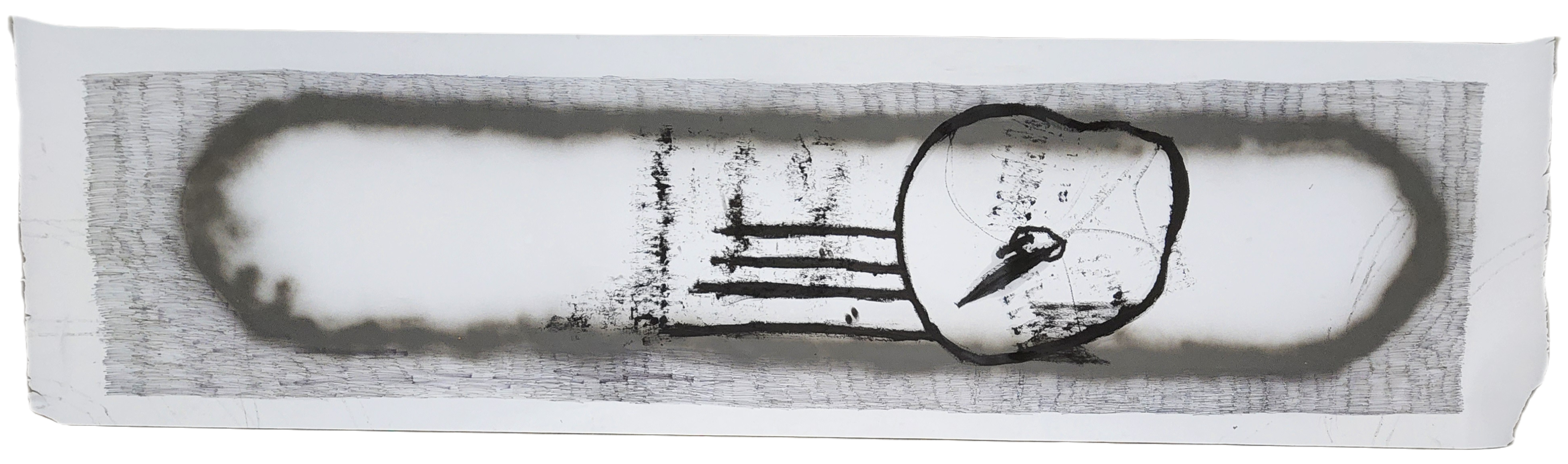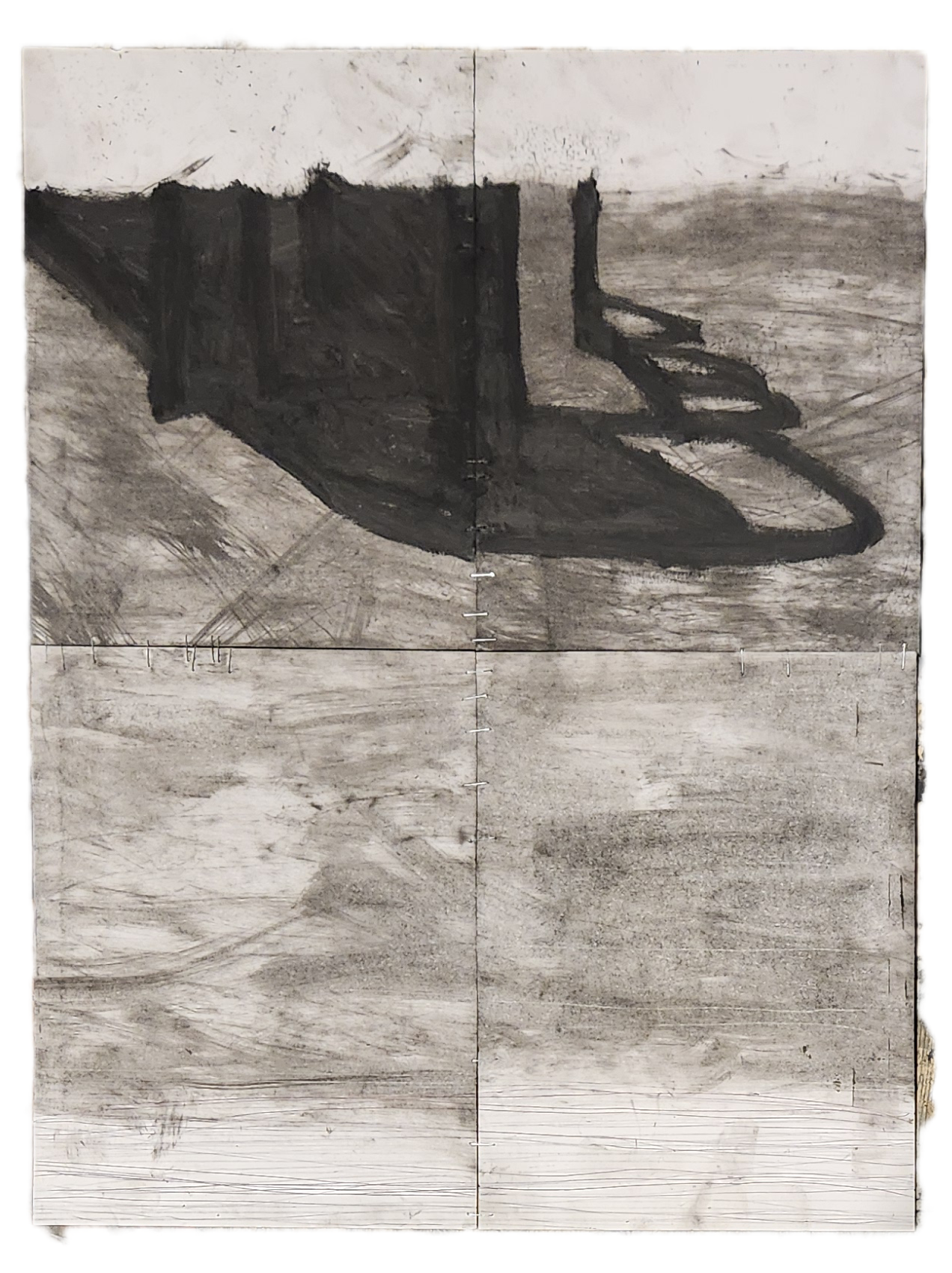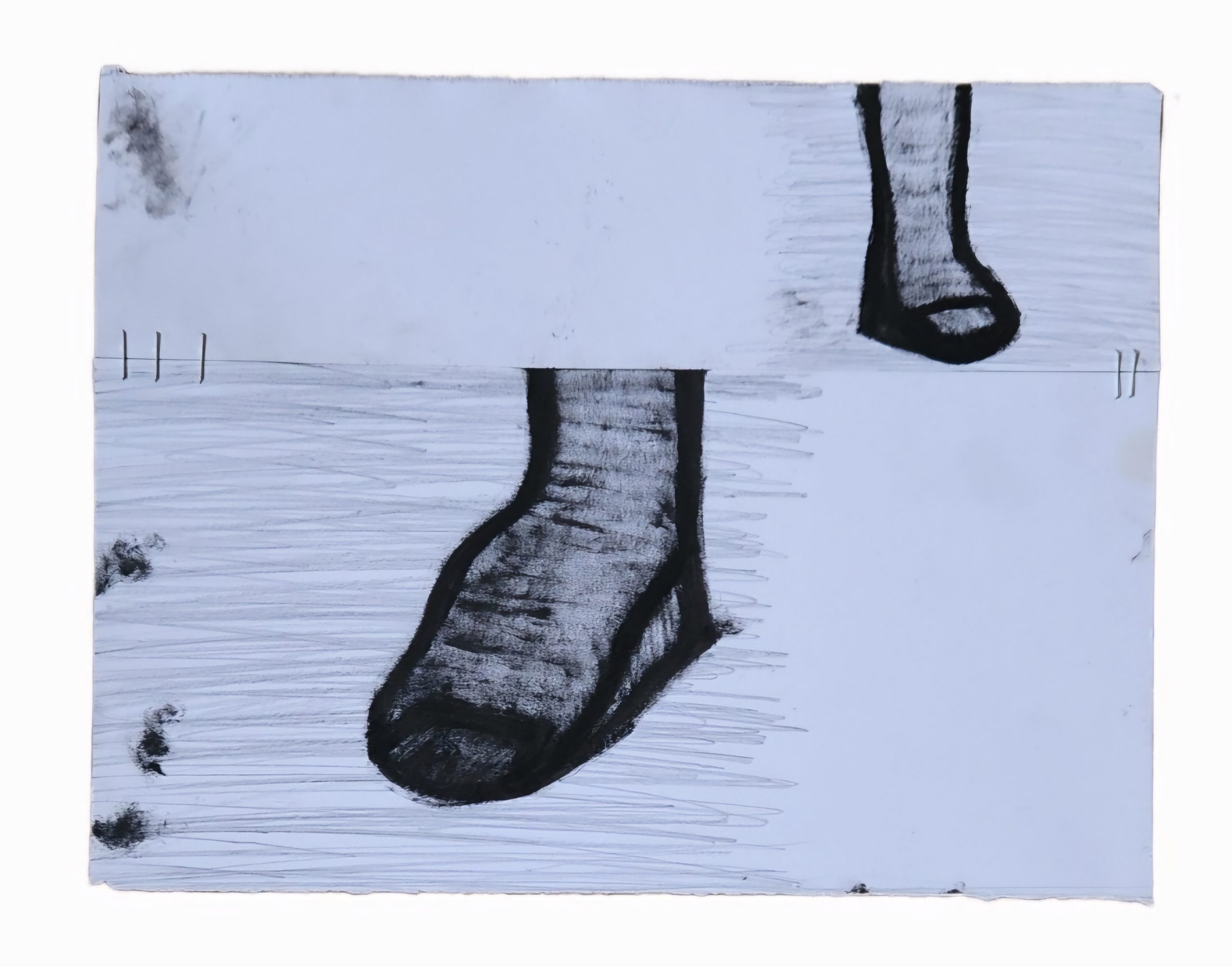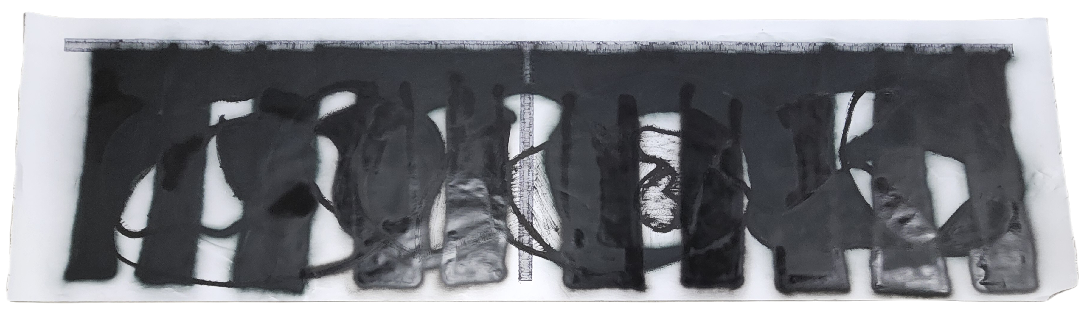 Sombra con mano. (El perro.) 06/2025. Lápiz, pluma, plumón, pincel recargable, tinta para sellos y óleo sobre melamina. 200 x 122 cm