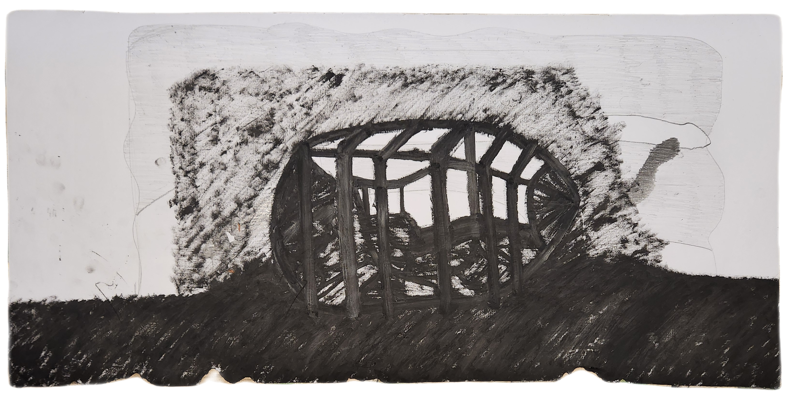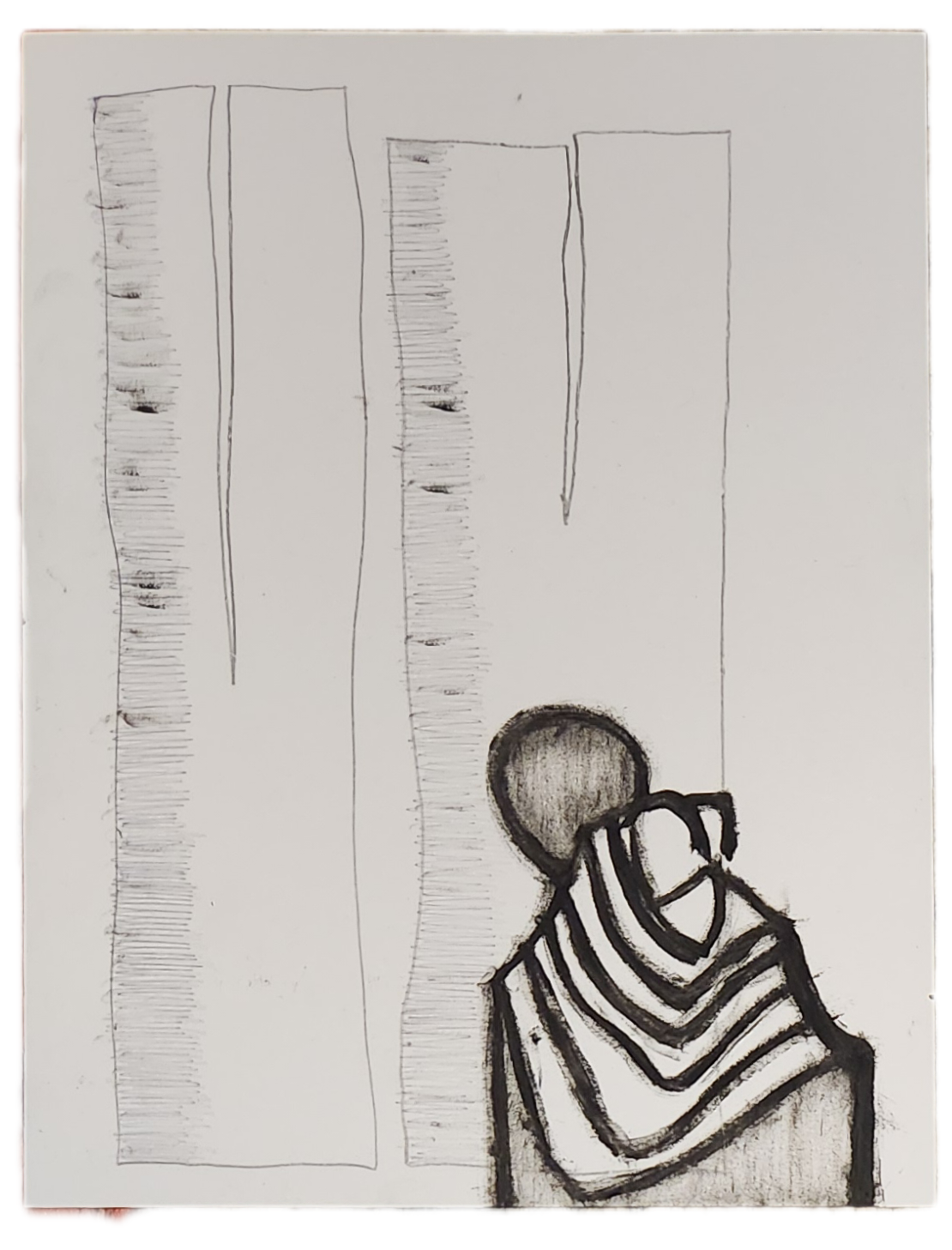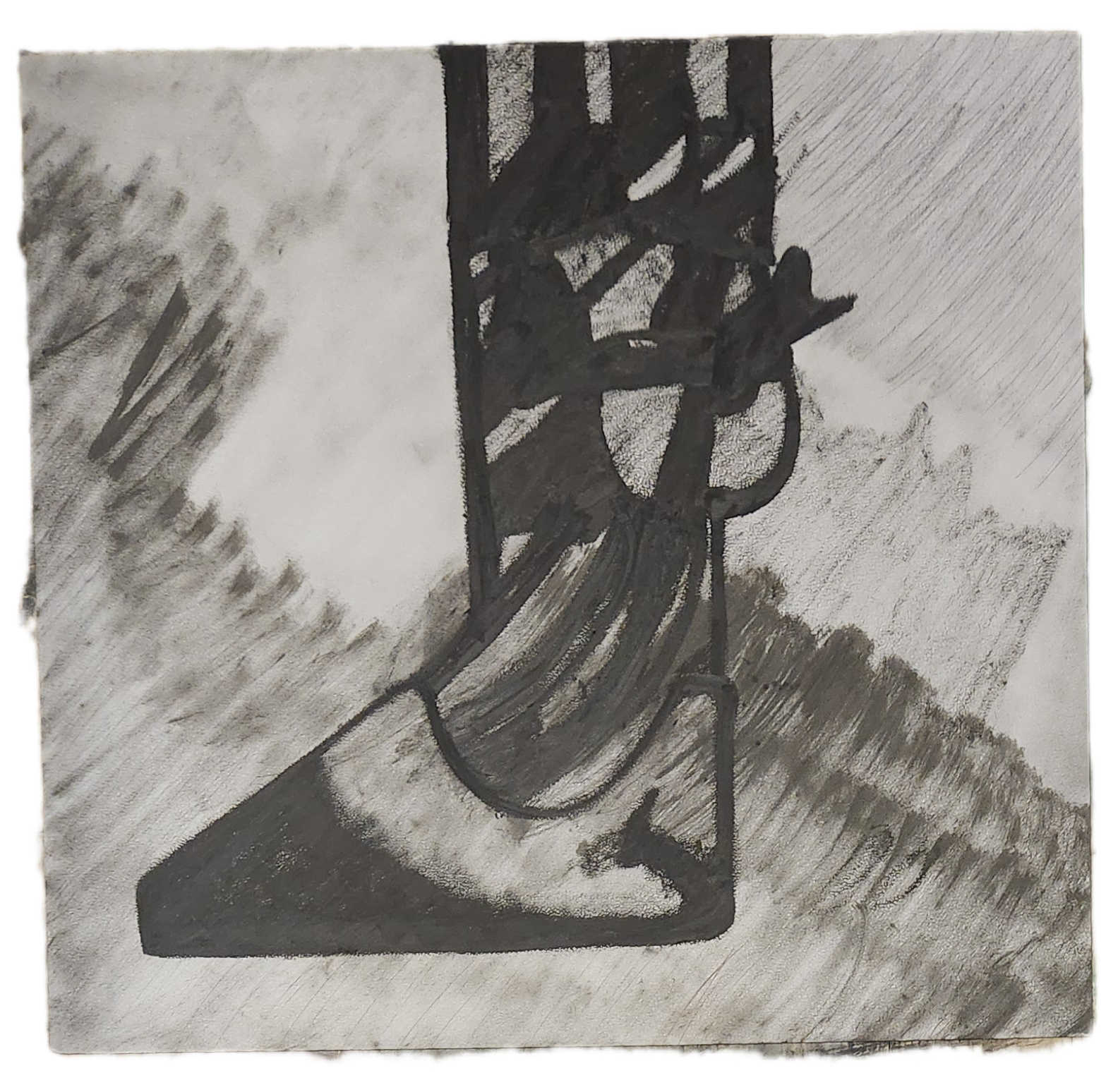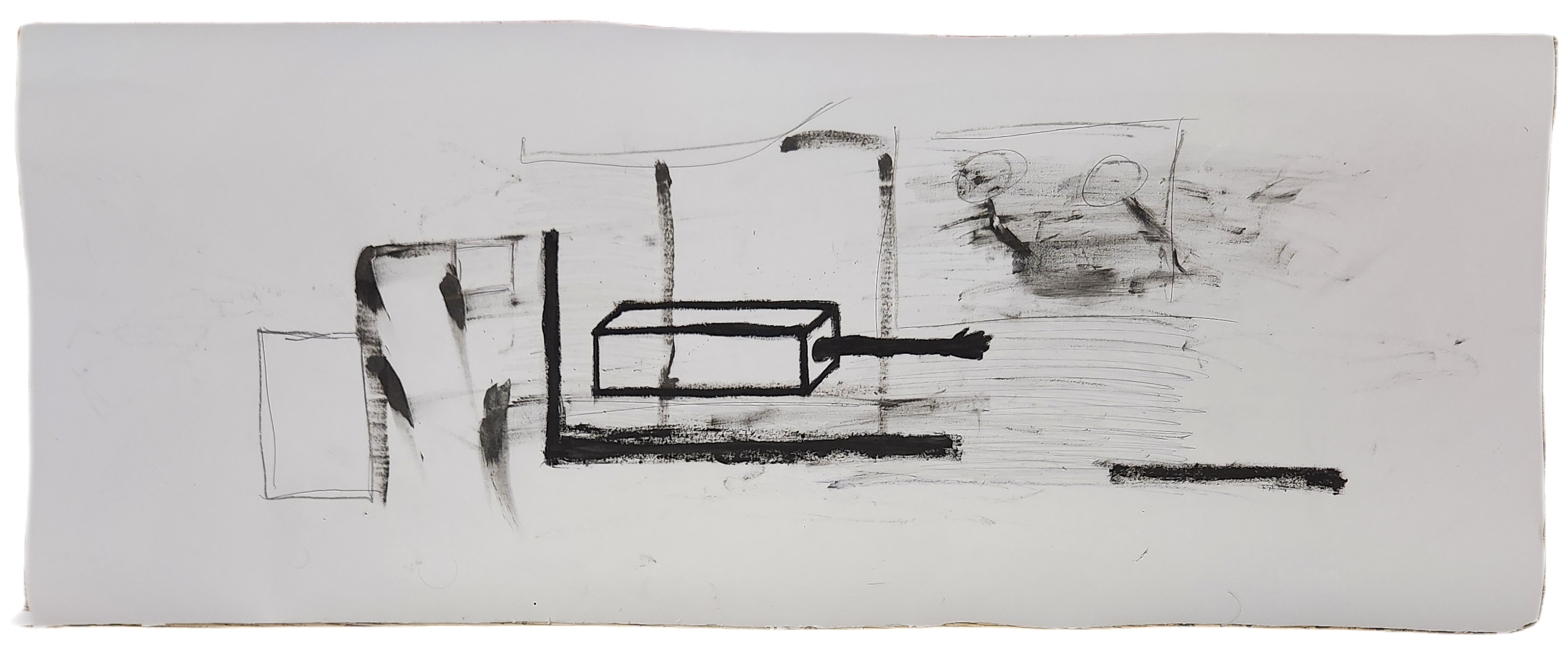 Sombra con mano. (El perro.) 06/2025. Lápiz, pluma, plumón, pincel recargable, tinta para sellos y óleo sobre melamina. 200 x 122 cm