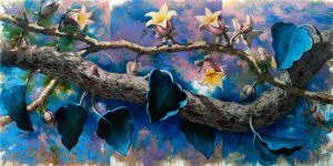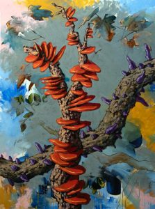 Jarol Rodríguez conecta su cuerpo creativo a una red vegetal continua. Como partes fragmentadas de algo mayor, cada cuadro avisa la necesidad del próximo y parte -él mismo- enunciado de uno anterior. Su trabajo no se lee aislado, sino como resultado colectivo de un cosmos personal que ya tiene Jarol dando vueltas en la cabeza hace bastante tiempo. Sus flores, ramas y frutas arman con el tiempo un jardín pictórico que se expande y ha sido la obsesión persistente de su trabajo. Jarol crea con paciencia la morfología de su propio mundo.