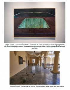 Cuarenta días de oscuridad, solemne homenaje a su bisabuelo minero fallecido en un rescate bajo mina, concebida con materiales originales de los dos sitios mineros referidos y el viejo farol de carburo que colgaba en su cadera en el momento del rescate de su cuerpo inerte; Un km de im-pureza, video instalación que reedita la intervención que realizó originalmente en Minas en el nacimiento y recorrido de un manantial de agua pura contaminado por el cobre en su curso hacia el hábitat humano.