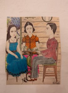 “La visita”. Noel González. Mixta sobre cartulina recuperada. Artista autodidacta de Minas invitado con tres piezas.