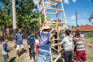 “Árboles raros”. Maykel Rodríguez. Instalación. Madera de pino. Emplazamiento de tres torres arbóreas producidas in situ y a la vista de todos, acción que se tornó participativa en un espacio público de Minas.