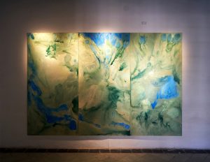 Ariagna Álvarez. “Realce”. Minerales de carbonatos de cobre sobre lienzo. 3.50 x 4.50m