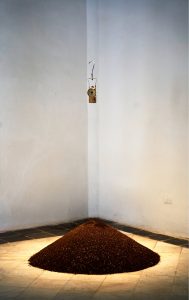 Ariagna Álvarez. “Cuarenta días de oscuridad”. Instalación. 75 kg de tierra de Aguas claras y farol del bisabuelo minero de la artista.