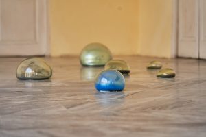 Ariagna Álvarez. “Territorios y memorias”. Instalación. Burbujas de vidrio soplado, minerales de cobre y oro. Dimensiones variables.