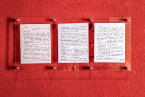Adrián Lamela. “Prólogo. Memoria (re) escrita”. Carta manuscrita montada en acrílico. Dimensiones variables.