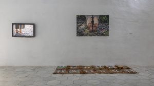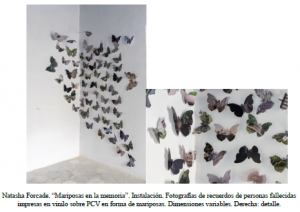 Natasha Forcade. “Peregrinación hacia un pasado vivo”. Instalación. Serie de 12 fotografías 35x35cm en vinilo sobre PVC, fotografía 80x120cm vinilo sobre PVC, tierra y piedras recolectadas por la artista en su recorrido y video documentación del performance en el sitio.