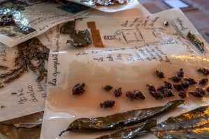 Osmín”. Celia Garcia. Collage. Ramas, hojas, resina, cartulina y fragmentos de relatos de Osmín Dovales sobre la naturaleza de Minas.