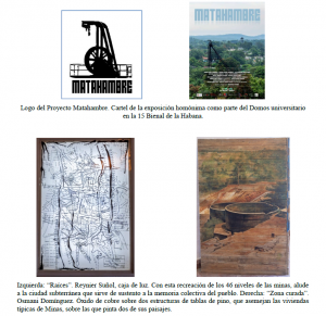 En respuesta gestamos la exposición MATAHAMBRE, dentro del proyecto curatorial universitario Domos e insertada en la 15 Bienal de La Habana, con la intención de visibilizar y poner en valor la riqueza actual de aquel pueblo, compartir su horizonte con la realidad diversa que proponía la Bienal, colocarlo en el mapa cultural de su contexto. Con esta exposición nacía además el Proyecto Matahambre, con el que no sólo proponíamos desarrollar nuevas acciones, sino que nutría el registro de proyectos artístico-pedagógicos generados por nuestra Facultad, con la peculiaridad de ser un proyecto de investigación-creación colectiva, con una investigación de campo en y sobre un territorio en crisis, iniciando un nuevo modo de llevar a la práctica los conocimientos teóricos adquiridos en una serie de materias que no traspasaban el umbral de la academia ni veían una aplicación concreta.