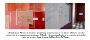 En Trazos de ausencia apela a los dibujos que realizó para comunicarse en las cartas de los mayores (pues entonces todavía no sabía leer y escribir), recuperados de su imagen-materia, refiriendo a Brea, para descargarlos de memoria y convertirlos ahora en arte en la medida en que los transforma en una animación o imagen-flujo propia de la era digital. En Nadie sabe el recorrido que lleva una carta, conjunto de cartas “censuradas” por el artista acompañadas por audios originales recuperados, refiere la prevención que lleva a la familia a tachar pasajes “conflictivos” que pueden ser hallados en la escritura íntima o familiar, información que puede caer en manos “comprometedoras”.