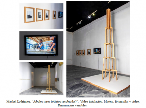 En Árboles raros (objetos recobrados), Maykel documenta en un video el proceso de producción de la primera versión de esta pieza en Minas con la participación de los pobladores, experiencia que ahora devuelve en incertidumbres acerca del concepto espacio público y del artista como activista de procesos participativos, meditación condensada en una nueva estructura en madera concebida como torre de pensamiento. Con El oro de los días (territorio recobrado), conjunto de serigrafías realizadas a partir de fotografías antiguas y concebidas con materiales simbólicos -pan de oro y tinta sobre láminas de cobre-, llega a la conclusión de que el valor asociado a la memoria colectiva existe y se reafirma como respuesta ante la intervención del artista-intruso que puede intentar “descubrirlo” y llegar a disociarlo.