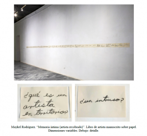 En Memoria íntima (artista recobrado) o Bitácora reflexiva, se presenta una nueva visión del sitio explorado con una reflexión sobre la pertinencia y los modos de inserción y de activación, siempre riesgosa, que puede tener el arte en una microhistoria determinada. En el análisis de su experiencia, pasó del estatuto del artista que produce y propone al de un “artista rescatado en proceso”, es decir, replanteado y sin conclusiones, con preguntas que ahora llenan su bitácora reflexiva o suerte de libro de artista, cuyas páginas se despliegan sobre la pared de la galería cerrando (o abriendo) su propuesta.